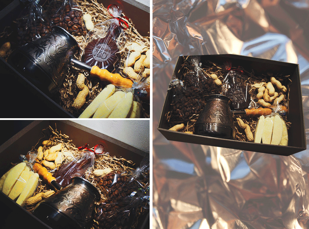 Многие люди предпочитают начинать свой день с крепкой чашки кофе. Если кто-то из твоих знакомых и друзей жить не может без этого напитка, кофейный набор станет для них идеальным подарком. Помимо 2 сортов ароматного кофе в него входят вкусный банановый мармелад, арахис в скорлупе, фигурка ручной работы из темного бельгийского шоколада и даже стильная турка из настоящей меди — все, что нужно, чтобы сделать любой кофе-брейк по-настоящему вкусным и бодрящим.
