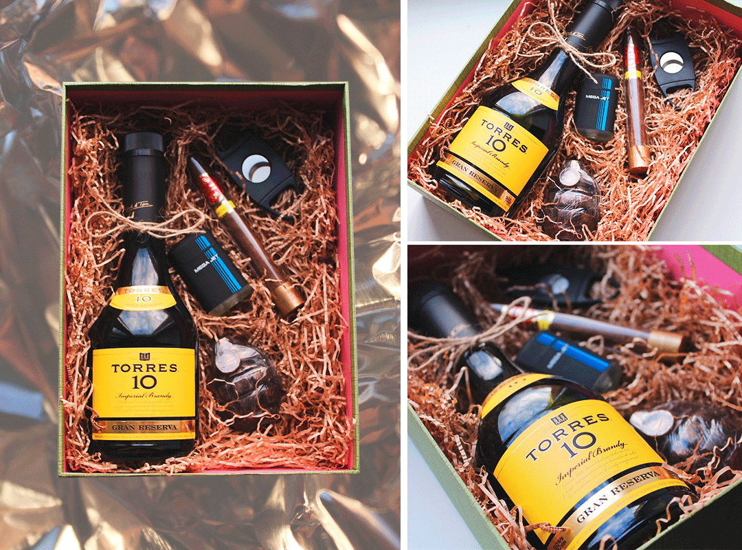 Классический, но вовсе не банальный подарочный сет для мужчины — бутылка достойного испанского бренди Torres 10 Gran Reserva и сигара Cubana Original Corona Premium, скрученная из отборных ароматных табаков. Напиток десятилетней выдержки порадует своего обладателя глубоким ароматом и насыщенным, но мягким вкусом с оттенками ванили, орехов и корицы. Для полного удовольствия в наборе имеются механическая зажигалка Double Jet и гильотина, а также ароматное мыло ручной работы в форме гранаты в качестве приятного бонуса.