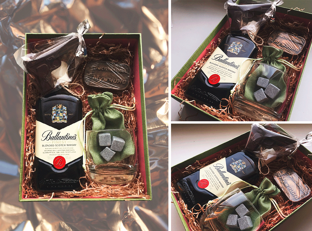 С таким набором будет нетрудно порадовать любителя хорошего виски, даже если ты не являешься алкогольным экспертом. Бутылка знаменитого шотландского купажированного виски Ballantine`s Finest, стильный бокал и каменные кубики для охлаждения напитка — лучшее сочетание для глубокого релакса, которое может порадовать мужчину после тяжелого рабочего дня или в праздничный вечер. К набору также прилагается фигурка-пистолет из темного бельгийского шоколада и ароматное мыло ручной работы для настоящего мужчины.