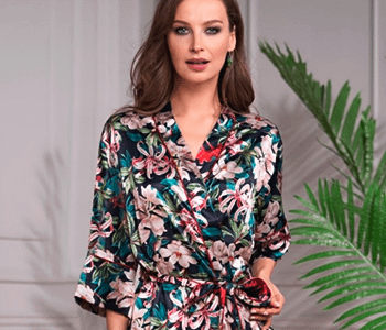 Халатов в домашнем гардеробе должно быть минимум два. Нежный и уютный из натурального материала — чтобы завернуться в него после душа. Как правило — это мягкая, махровая ткань из бамбуковых или хлопковых нитей. Она не мнется, не соскальзывает с тела и хорошо впитывает влагу, позволяя телу дышать. Махра не обязательно должна быть толстой, ты всегда можешь выбрать облегченные махровые халаты, велюровые или жаккардовые.