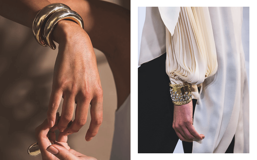Широкие браслеты идеально подойдут практически к любому образу, гармонично дополнив и элегантное вечернее платье, и офисный лук, и наряд в стиле casual. Удобно, что в тренде самые разные модели: элегантные теннисные, манжеты, цепи, ободы и полуободы, инкрустированные самоцветами и в чисто металлической интерпретации. Как правило, браслеты такого рода носятся в одиночку, но при желании их можно дополнять другими, более лаконичными.