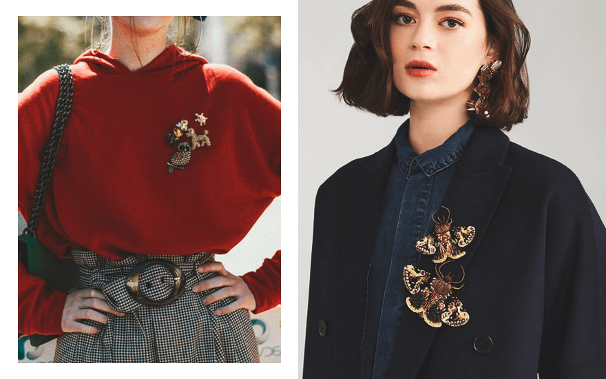 В этом году брошь станет одним из самых модных украшений. Таким, казалось бы, старомодным аксессуаром вполне можно дополнить любой стритстайл-образ. Например, прикрепив к воротнику блузы, рубашки или платья, лацкану пиджака, жакета, блейзера или на переднем кармане джинсовки или кожаной косухи. Еще один совет от ювелирных дизайнеров: выбирай одну крупную брошь или носи сразу несколько мелких, объединенных в одну композицию.