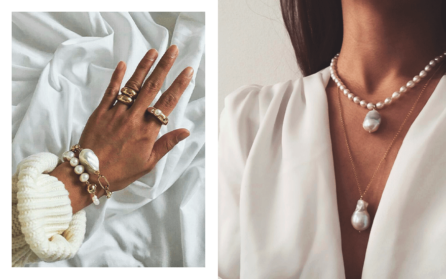Украшения с жемчугом — классика, которая наравне с маленьким черным платьем, наверное, никогда уже не выйдет из моды. Выбирай серьги с камнем неправильной формы или необычного оттенка, например розового или черного. Более того, не бойся сочетать винтажный жемчуг с другими украшениями в совершенно разной стилистике. В частности, если надеть жемчужное колье вместе с изящным серьгами-каффами и парой широких гладких колец, получится яркий образ, который нельзя не заметить.