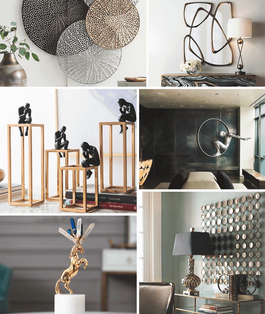 Металлический декор всегда выглядит эффектно и притягивает к себе внимание. Более того, он может стать главным акцентом твоего интерьера, создать интересную игру света и тени. Присмотрись к мебели с металлическими деталями, фактурным стеновым покрытиям, кухонной плитке, металлизированным занавескам, классическим скульптурам и статуэткам. Такой декор универсален и будет гармонично смотреться в классическом и скандинавском интерьерах, минимализме, ар-деко, готике и в индустриальном дизайне.