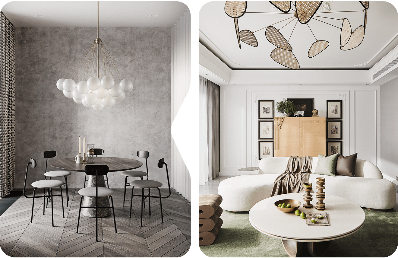 Этот тренд можно использовать, выбрав круглую мебель. В интерьере гостиной хорошо смотрятся диваны в виде полумесяца с журнальными столиками без углов. На кухне можно поставить круглый обеденный стол и стулья со спинками обтекаемой формы.