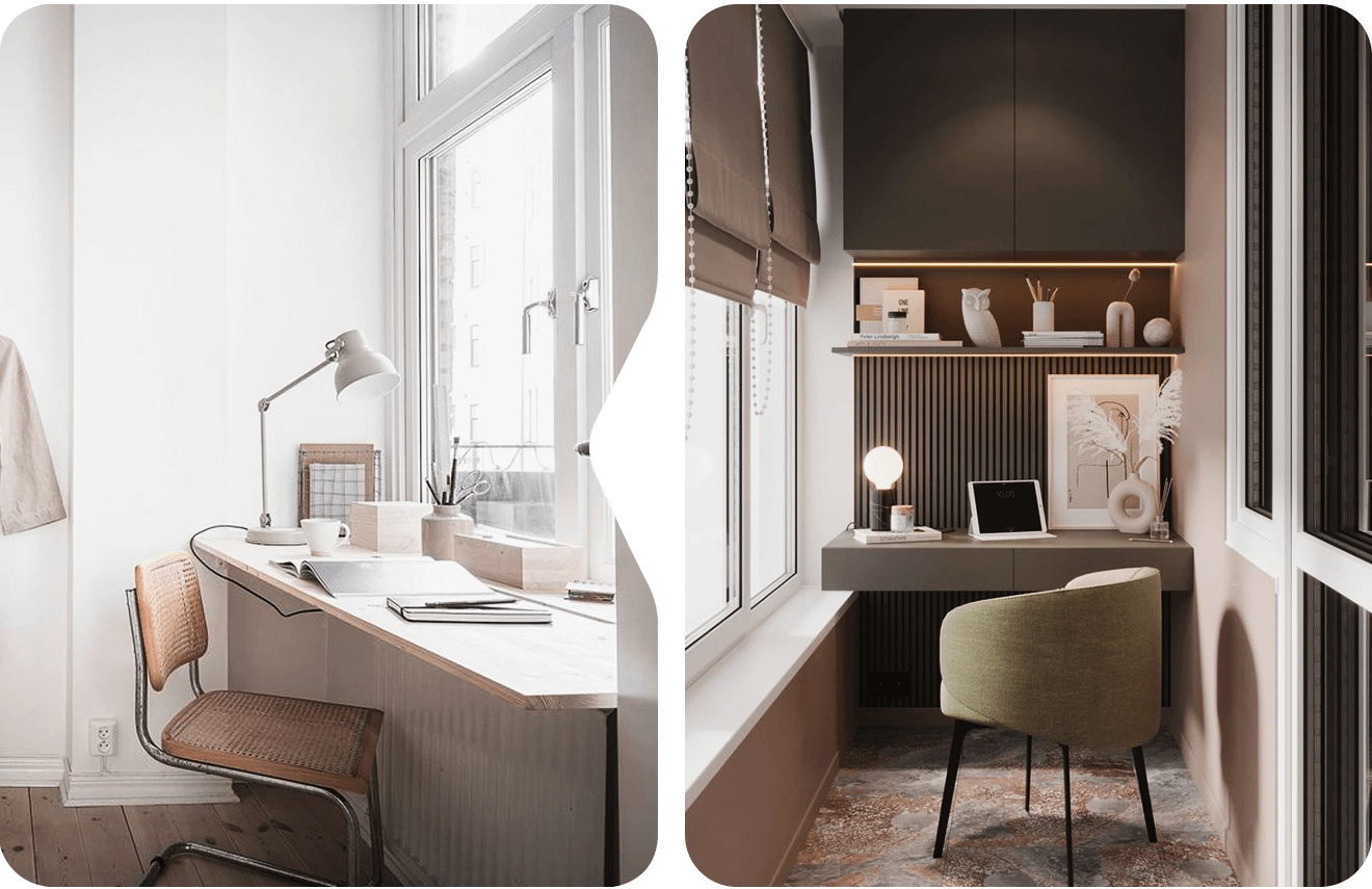 Если ты планируешь работать в формате хоум-офиса, стоит заранее оборудовать себе место. Популярный вариант для интерьера небольших квартир — кабинет в лоджии. Там много естественного света и хорошая вентиляция. Главное, чтобы в лоджии было тепло и уютно.