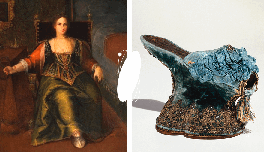 Венецианская мода XVI и XVII века подарила миру чопины — туфли на высокой платформе. В некоторых случаях они были по-настоящему экстремальной высоты, поэтому дамам нужна была помощь слуг, чтобы передвигаться. К слову, в этой обуви походка была неуклюжей, так как особым удобством они не обладали.