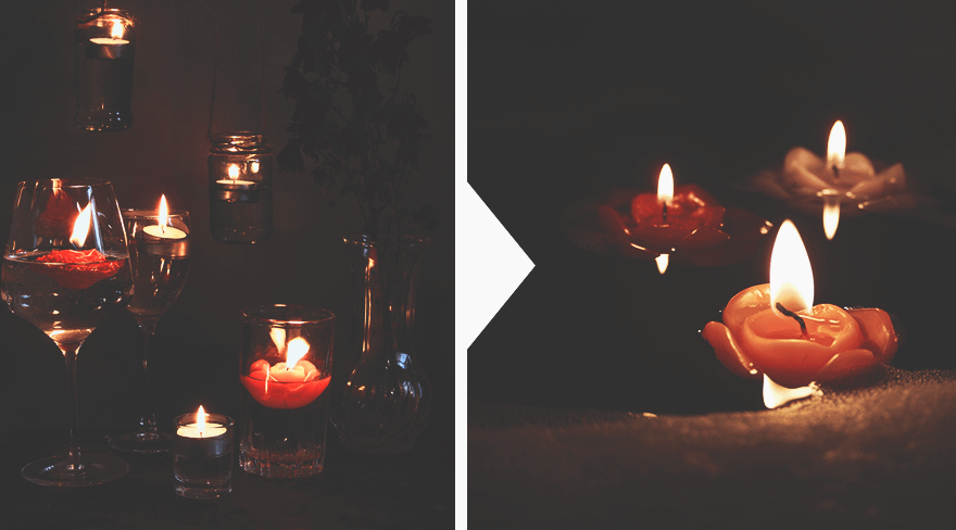 Плавающие свечи смотрятся аккуратно и нежно, без труда вписываясь в любой интерьер. Необычными их делает емкость с водой, которую обычно используют в качестве подсвечника: пламя будет отражаться в воде, распадаясь на множество мерцающих огоньков. Интересный вариант — поставить зажженную свечу в широкий бокал, дополнив композицию стопкой книг или вазой со свежими цветами.