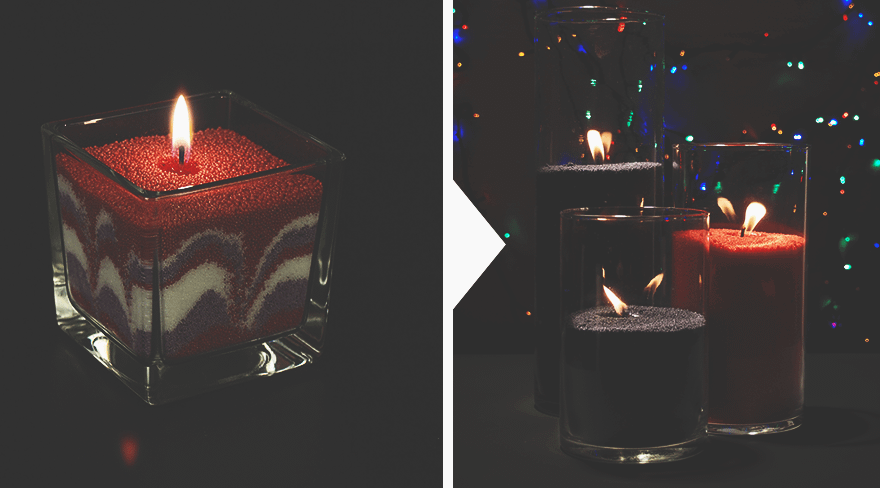 Насыпные свечи – это свечной песок, который вы засыпаете в негорючий сосуд. Подойдет фужер, ваза и половинка кокоса. Подбери цвета под интерьер и сочетай по своему усмотрению. В конце останется вставить фитиль и поджечь. Насыпать песок в стаканы легко и весело — позови детей и развлекайтесь. Насыпная свеча не прогорает до конца, а лишь на длину фитиля – это практично. Огонь остается внутри сосуда – это безопасно. Большие колбы можно расставить по периметру комнаты, а маленькими украсить стол.
