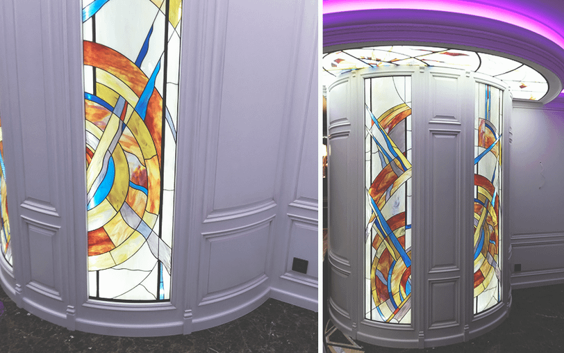 Узор и расцветка витража будут зависеть от общей стилистики помещения, главное, что даже незамысловатая геометрическая абстракция выглядит эффектно. Подсветка очень важна, ведь в прихожей чаще всего нет окон, а чтобы витражи «ожили», необходим хороший свет.