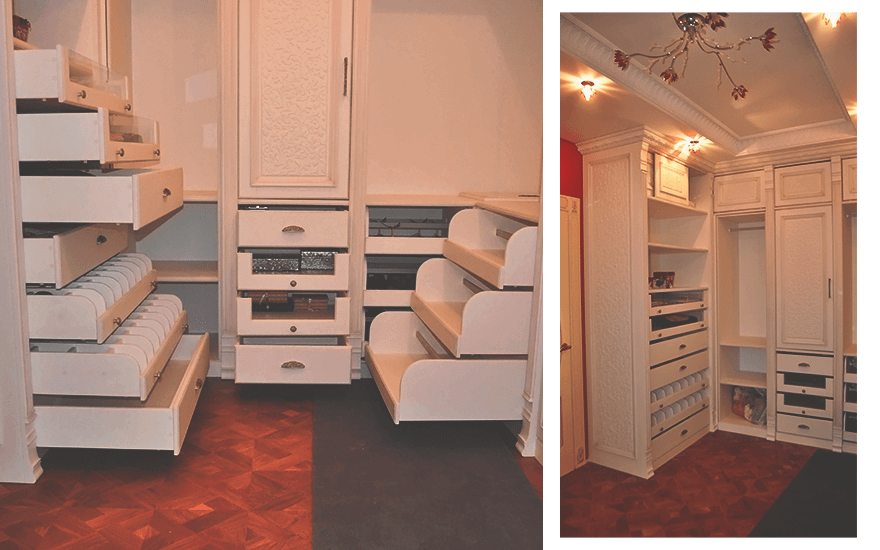 Особый шик – встроенная гардеробная, когда выдвижные ящики, полки, секретные секции начинают появляться словно ниоткуда.