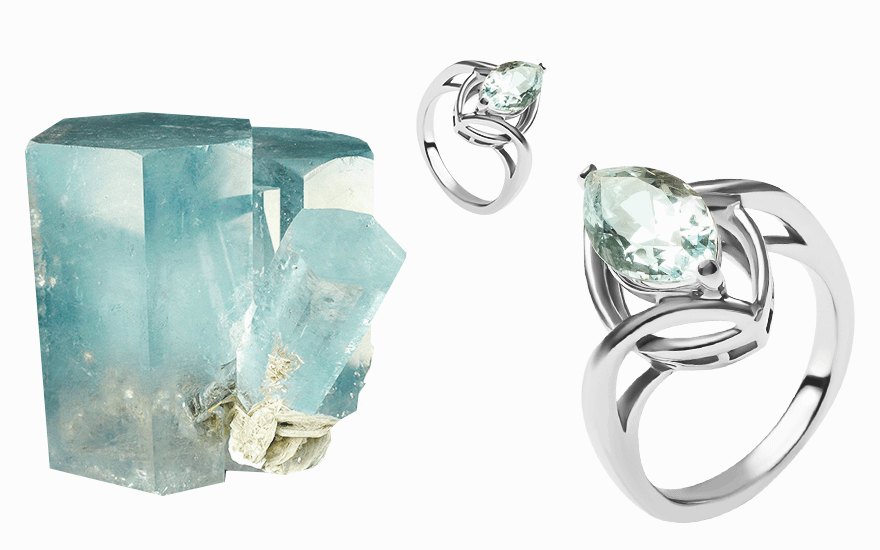 Аквамарин — полудрагоценный камень, являющийся разновидностью берилла, как и изумруд. Согласно одной из легенд, аквамарин появился из слез юной девушки, которая тосковала по возлюбленному, сидя на берегу океана. Ее слезы падали в холодную морскую воду и моментально застывали, превращаясь в нежно-голубые самоцветы. С тех пор камень называют «душой моря», которая помогает морякам и путешественникам безопасно передвигаться по морской глади, а также символом вечной молодости и любви.
