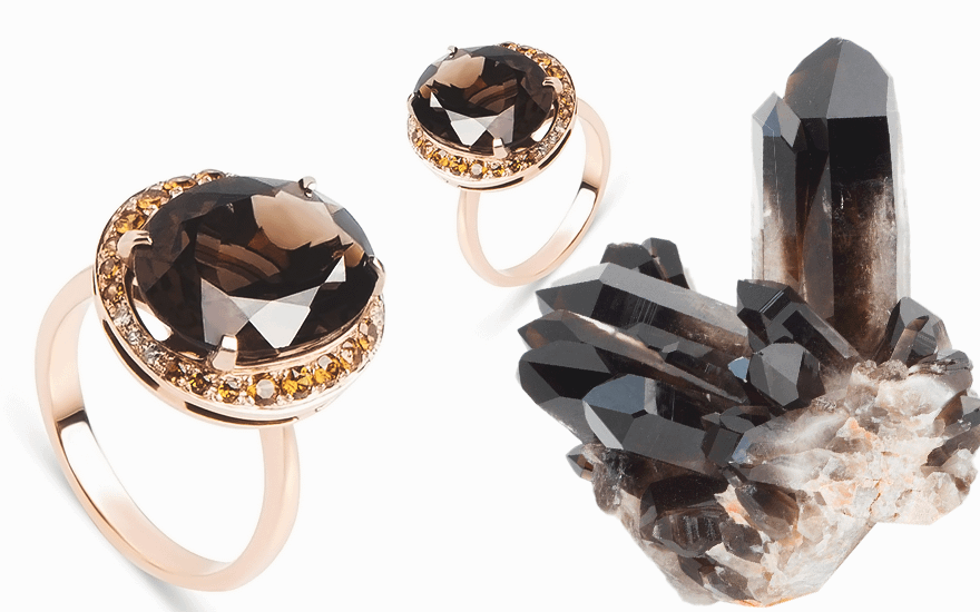 Если ты поклонница базовой палитры в аутфитах, присмотрись к дымчатому кварцу, или раухтопазу, – он обещает быть на пике популярности весь предстоящий год. Расцветка минерала может варьироваться от серо-коричневого с золотистыми оттенками до чернильно-черного, который часто называют морионом. В Средневековье считалось, что дымчатый кварц имеет власть над темными силами, а если верить астрологам, то он помогает сохранять самообладание и не нервничать даже в самых непростых жизненных ситуациях.