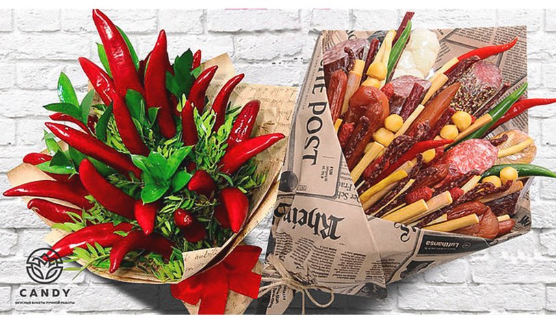 Не исключено, что тебе повезло, и парень все-таки обожает овощи, тогда обрати внимание на яркий букет с острым перцем чили, болгарским перцем, лаймом, редисом, чесноком и зеленью.