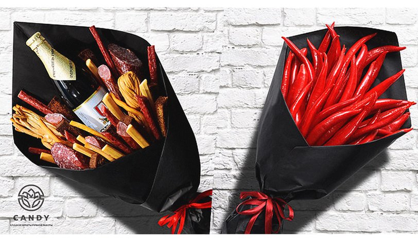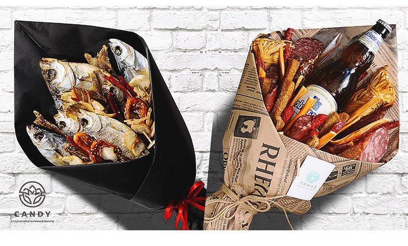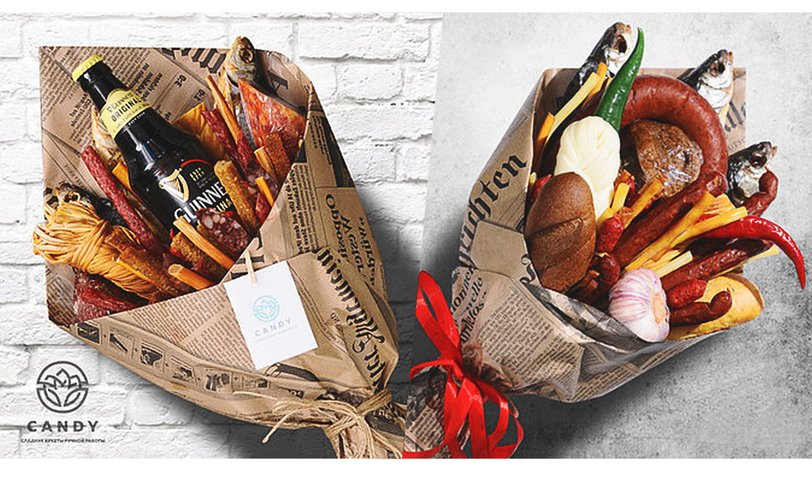 Другое дело — пивная композиция из свежих деликатесов в стильном оформлении. Такие оригинальные букеты есть в интернет-магазине CandyShop. Можешь выбрать набор с сырокопчеными пражскими и баварскими колбасками, сыром чечил, копчеными сырными шариками, карпачо из мяса птицы и острым перцем; рыбный букет или композицию из орехов с хрустящими булочками и сырокопчеными колбасками.