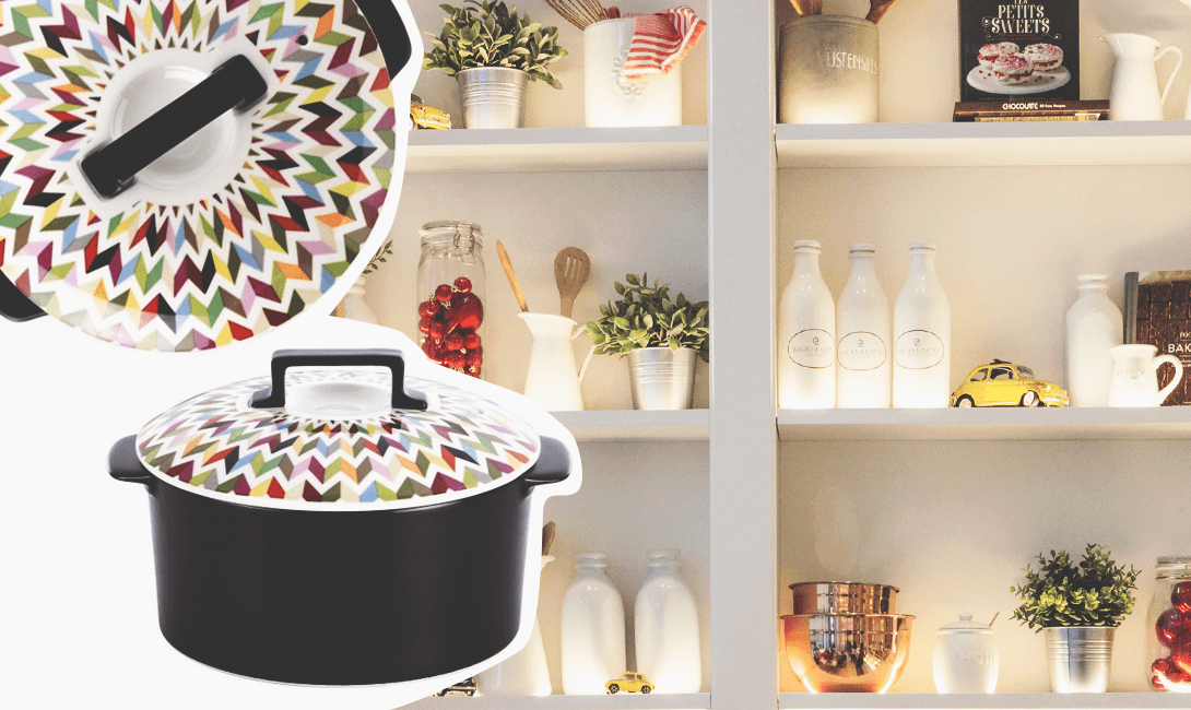 Керамическая кастрюля с варочной емкостью нейтрального черного цвета и яркой крышкой с калейдоскопическими узорами станет стильным и практичным украшением для любой кухни.