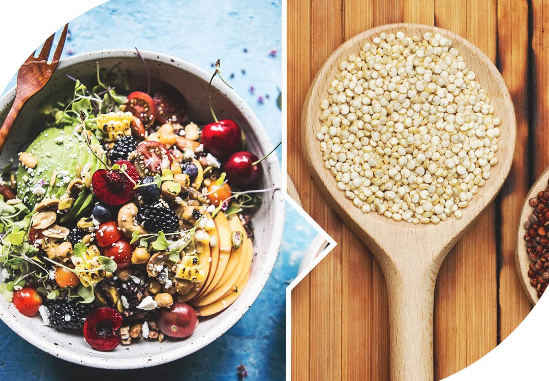 В этом салате ты можешь свободно экспериментировать с набором ингредиентов. Неизменными в нем остаются киноа, помидоры черри и сыр фета.
