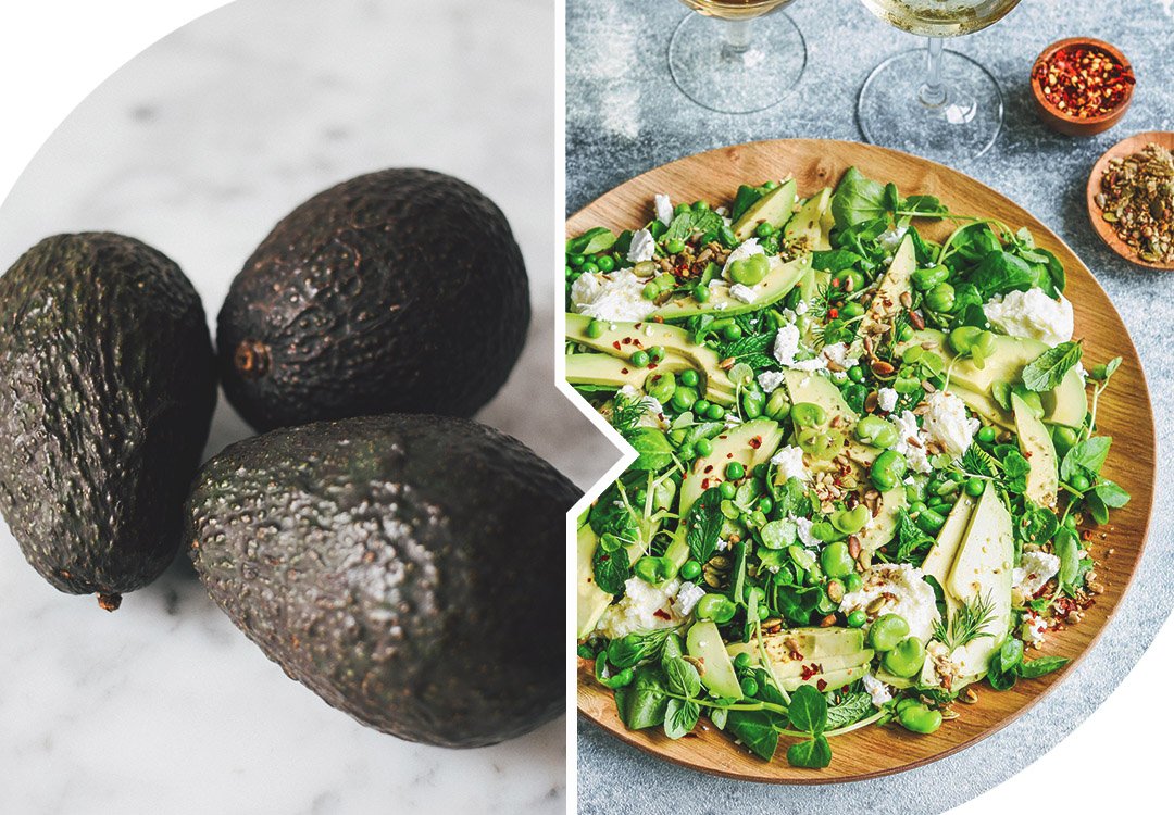Выкладывай на блюдо по очереди зелень, нарезанный полосками авокадо, сыр (моцареллу порви на кусочки, фету разомни), бобы и горох. Хорошо полей каждый слой заправкой. Укрась мятой и укропом.