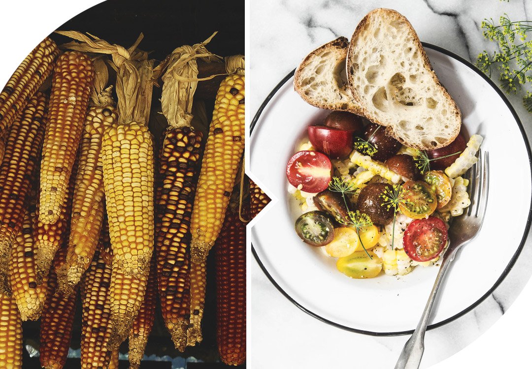 Приготовление: кукурузу бланшируй и аккуратно вынь из початка. Помидоры порежь на половины и смешай их с кукурузой. Полей оливковым маслом, лимонным соком и приправь солью и перцем. Укрась цветками укропа.