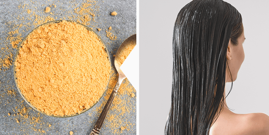 Столовую ложку порошка смешай с чайной ложкой жидкого меда, овсяной муки, кефира и сока лимона. Тщательно перемешай ингредиенты и нанеси состав на немытые корни волос. Затем укутай волосы целлофаном и полотенцем и оставь на 10-15 минут. Если будешь ощущать сильное жжение и дискомфорт, сразу же смой маску.