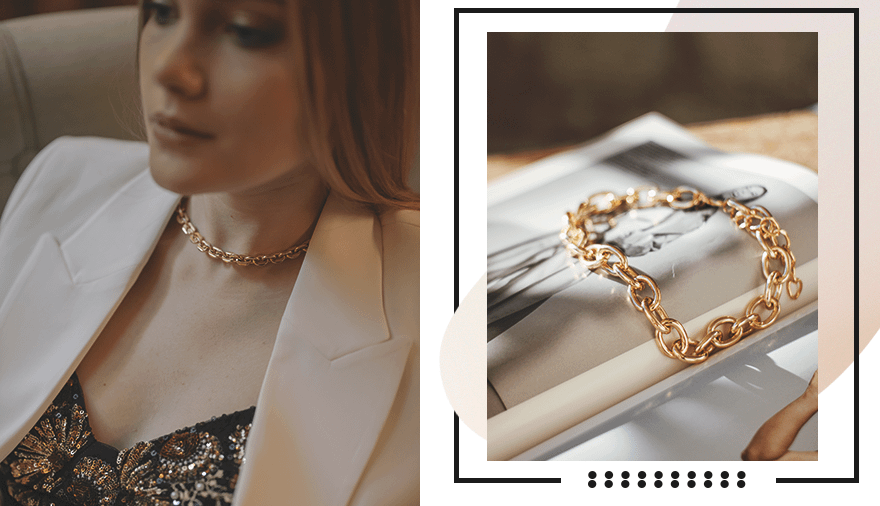 Лучше выбрать что-то одно: массивное колье дополнить минималистичными серьгами или к большим серьгам выбрать простую тонкую цепочку.