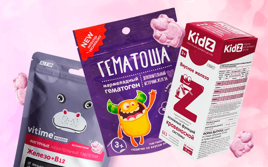 Компания ВТФ производит железосодержащие биодобавки с приятными вкусами и в удобной форме: KidZ — сиропы в стиках, Vitime — мармеладные пастилки и жевательные таблетки, Гематоша — гематоген по запатентованной технологии. Благодаря этому восполнить нехватку железа можно в любом месте и в любое время.