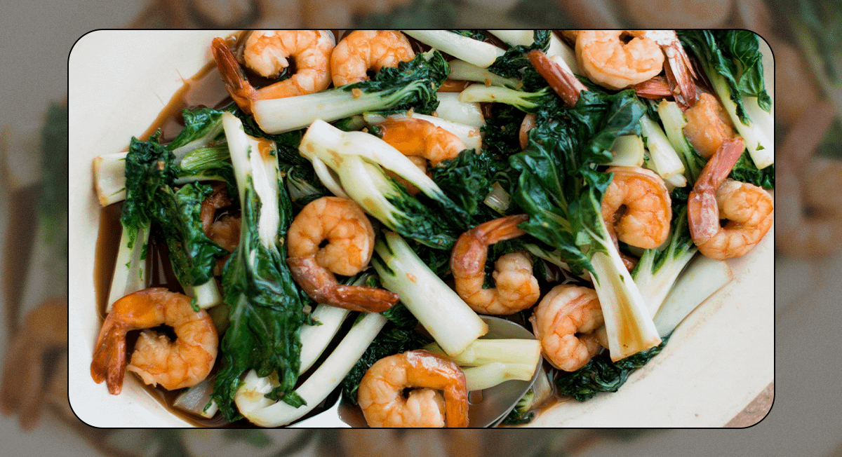 Промой салат пак-чой, лук и овощи. Нарежь продукты и смешай их с заранее отваренными и очищенными креветками.