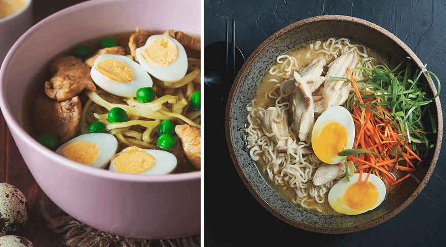 Вари яйца на среднем огне в течение 3-5 минут, затем положи их в холодную воду. Провари в отдельной кастрюле бок чой в течение одной минуты, переложи его в глубокую тарелку. Добавь в воду лапшу, провари ее до готовности, затем промой.
