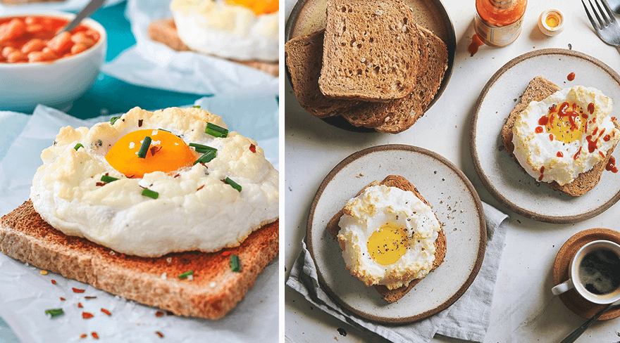Разогрей духовку до 180 градусов. Отдели белки и взбей их до образования жестких пиков. Вмешай в белки пармезан, после чего раздели смесь на 4 части: каждую аккуратно выложи на противень, сделай углубление и поставь будущие «облака» выпекаться. Через 2-3 минуты достань белки, добавь к ним целые желтки и вновь оставь яичницу в духовке на 3-5 минут.