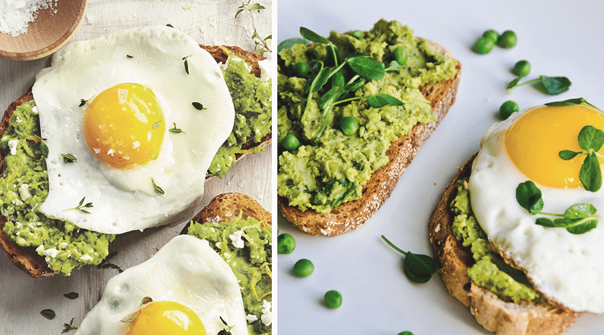 Сочетание хрустящего хлеба, пасты из горошка с кислинкой и яйца, обжаренного на сливочном масле, взбодрит тебя на все утро.