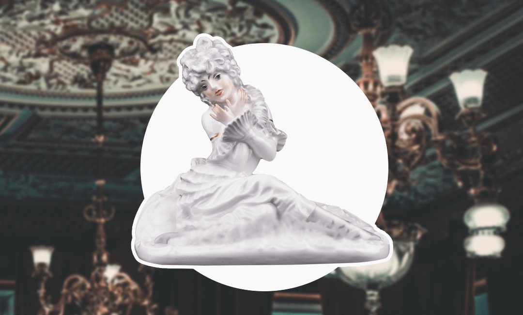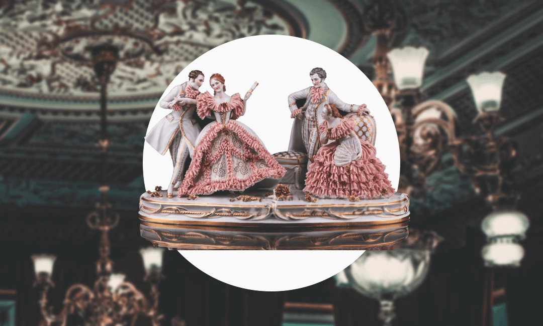 Статуэтка изображает сцену бала. Композиция выглядит невероятно живой и красивой: нежный фарфор, декоративная роспись, тончайшее кружево.