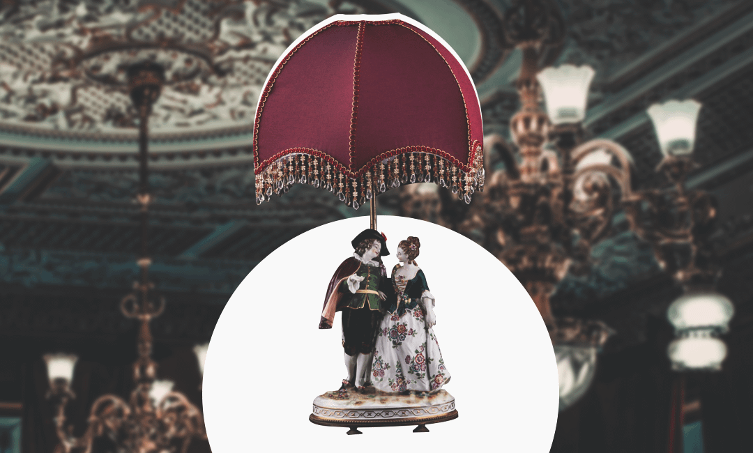Изысканный аксессуар и предмет интерьера – лампа с абажуром, украшенная фарфоровыми статуэтками начала 20 века.