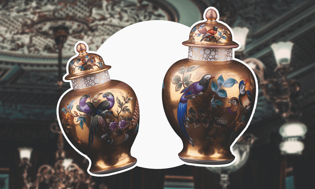 Живописные парные фарфоровые вазы были изготовлены в Германии во второй половине 19 века. В начале 20 века фабрика Helena Wolfsohn в Дрездене закрылась, так что до нас дошли лишь редкие образцы таких фарфоровых изделий.