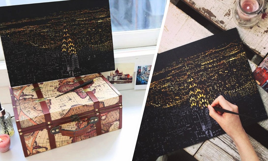 Техника создания скретч-картины очень проста, но сам процесс завораживает. Тебе нужно сцарапать серебристое покрытие с винилового листа, на который нанесено изображение. Для сюжетов скретч-картин чаще всего используют панорамы ночного города. Под твоей рукой оживает черно-серый Нью-Йорк, Париж или Гамбург. Ночной мегаполис начинает светиться тысячами огней.