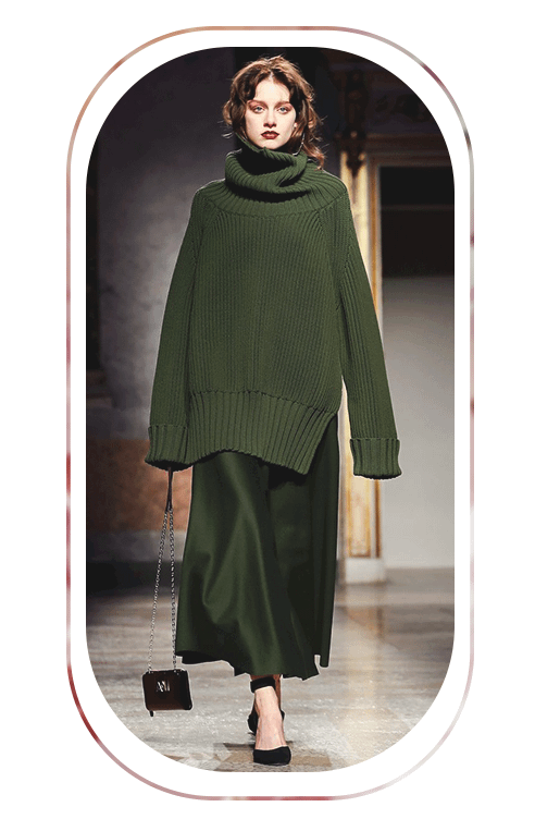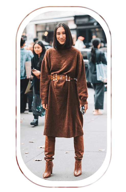 Чтобы придать образу изящности и собранности, используй толстый ремень. В этом сезоне в тренде яркий трикотаж, но для офисных будней лучше подойдут классические цвета: черный, серый, оттенки коричневого и молочного. Акцентности образу добавят и стильные аксессуары: очки с необычной оправой, кожаный берет, высокие сапоги или маленькая фактурная сумка.