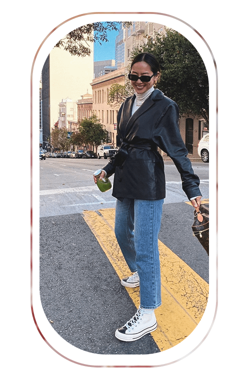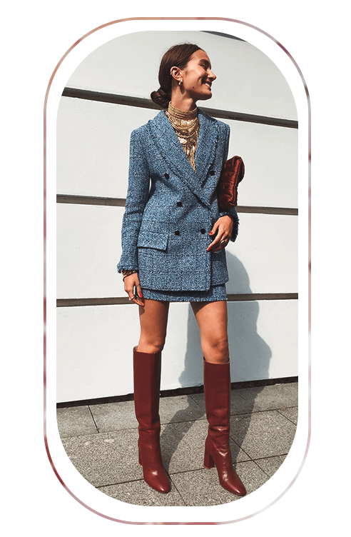 Выбирай пиджаки оверсайз кроя либо на размер больше, чтобы тебе было комфортно сочетать их с теплыми кофтами и водолазками.