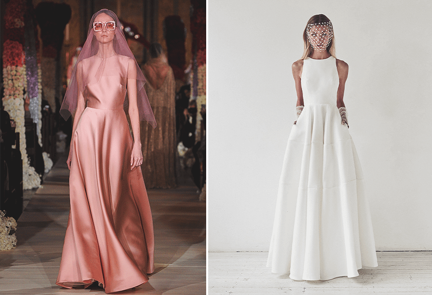 В числе модных трендов остаются платья со скромным дизайном, полюбившиеся многим невестам в прошлом сезоне. При этом в палитре цветов можно себя не ограничивать: дизайнеры используют как классический белый, шампань и слоновую кость, так и любые нюдовые оттенки. При этом стоит помнить, что скромно не равно скучно. Так, свадебное платье розово-кораллового оттенка ливанского дизайнера Рим Акры, дополненное максимально простой фатой и блестящими очками в квадратной оправе, смотрится одновременно изящно и игриво.