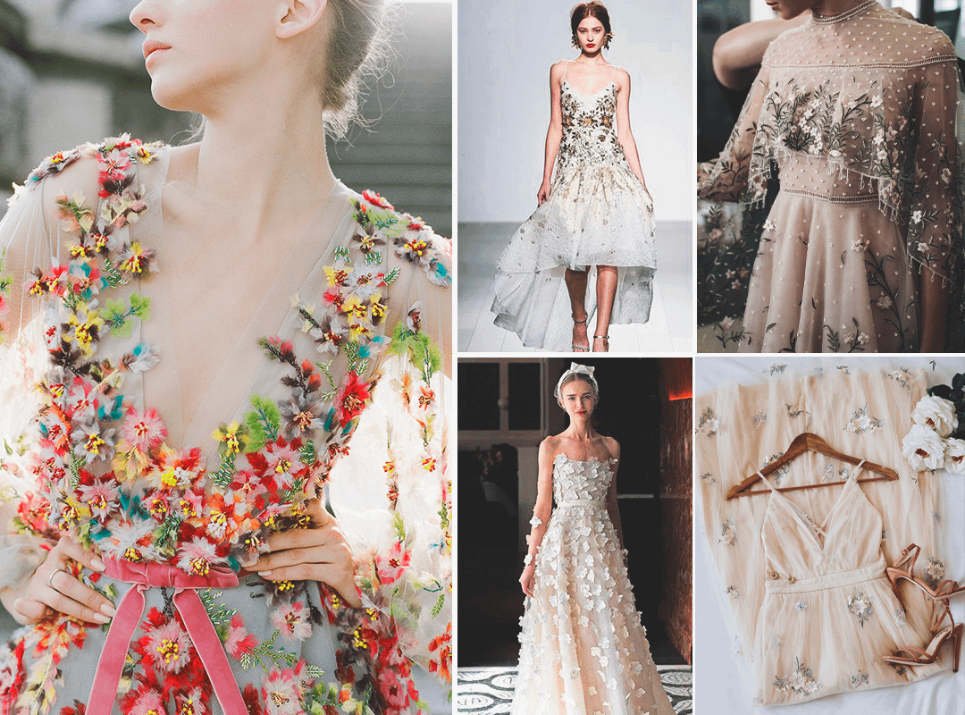 Цветочная тенденция настолько вездесуща, что перекочевала и на свадебные платья. Крупные трехмерные аппликации, ручная вышивка, аппликации из парчи и смелое использование ярких принтов — этот тренд не знает границ. Если тебе кажется, что цветочное платье — слишком яркий и насыщенный образ для новобрачной, останови свой выбор на лаконичном свадебном платье с простым флористическим узором, как в коллекции у Моник Люлье. Такой наряд позволит совместить классику с трендовым декором и создать чистый, нежный образ невесты.