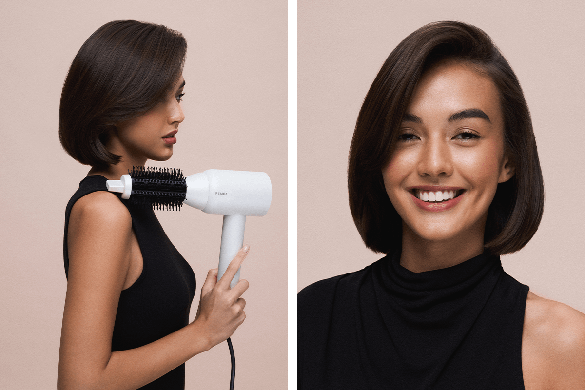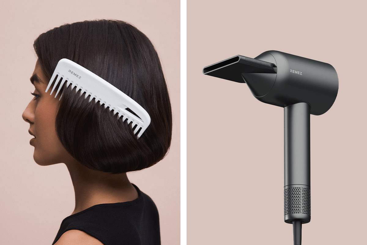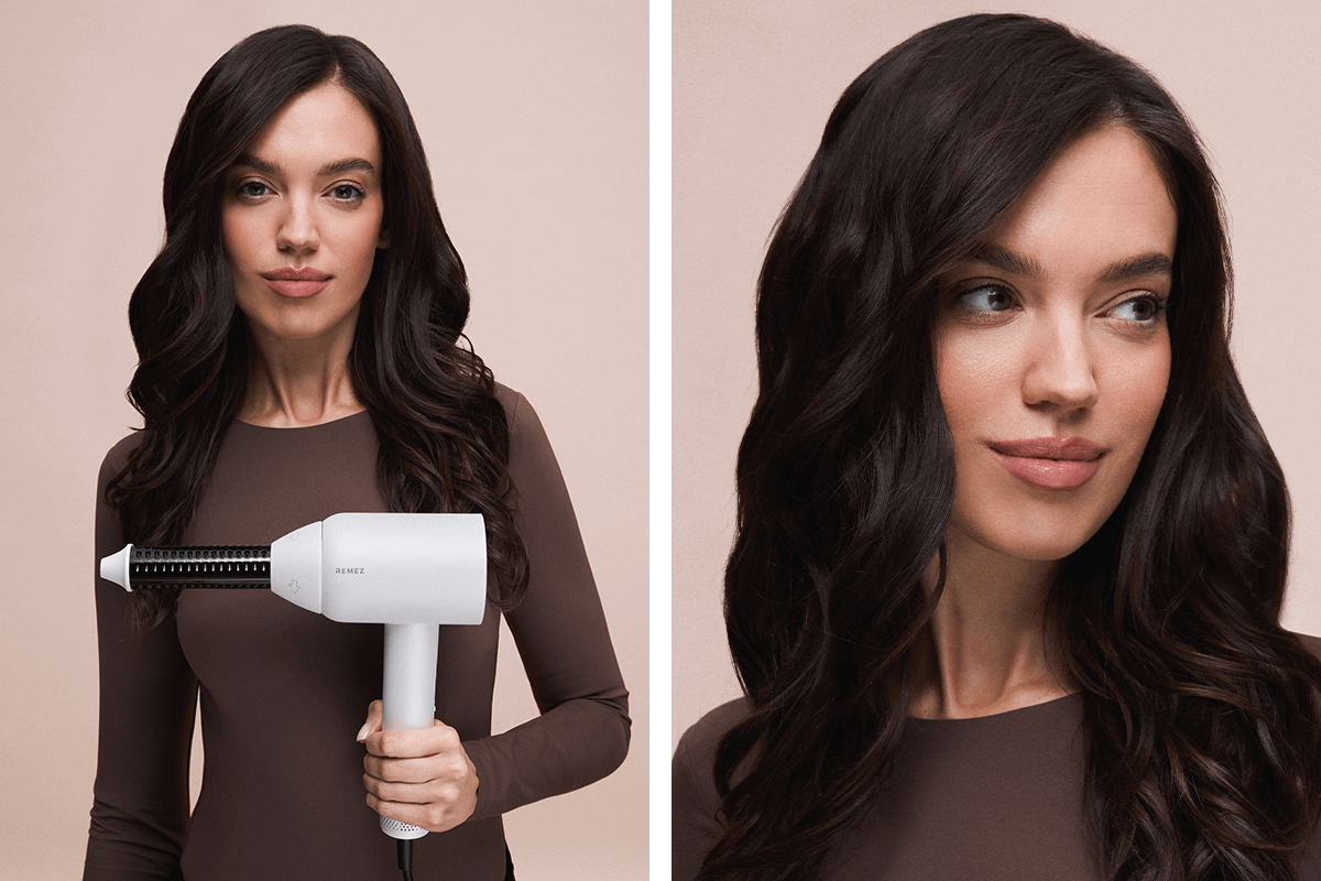 - Чтобы запечатать укладку, сначала задержи у корней насадку с теплым воздухом, а потом переключись на холодный режим. В фене-стайлере REMEZ есть режимы для всех типов волос, даже для детских и поврежденных. Сможешь настроить под себя и сушить пряди бережно.