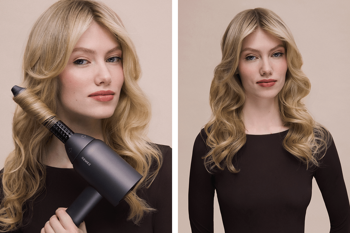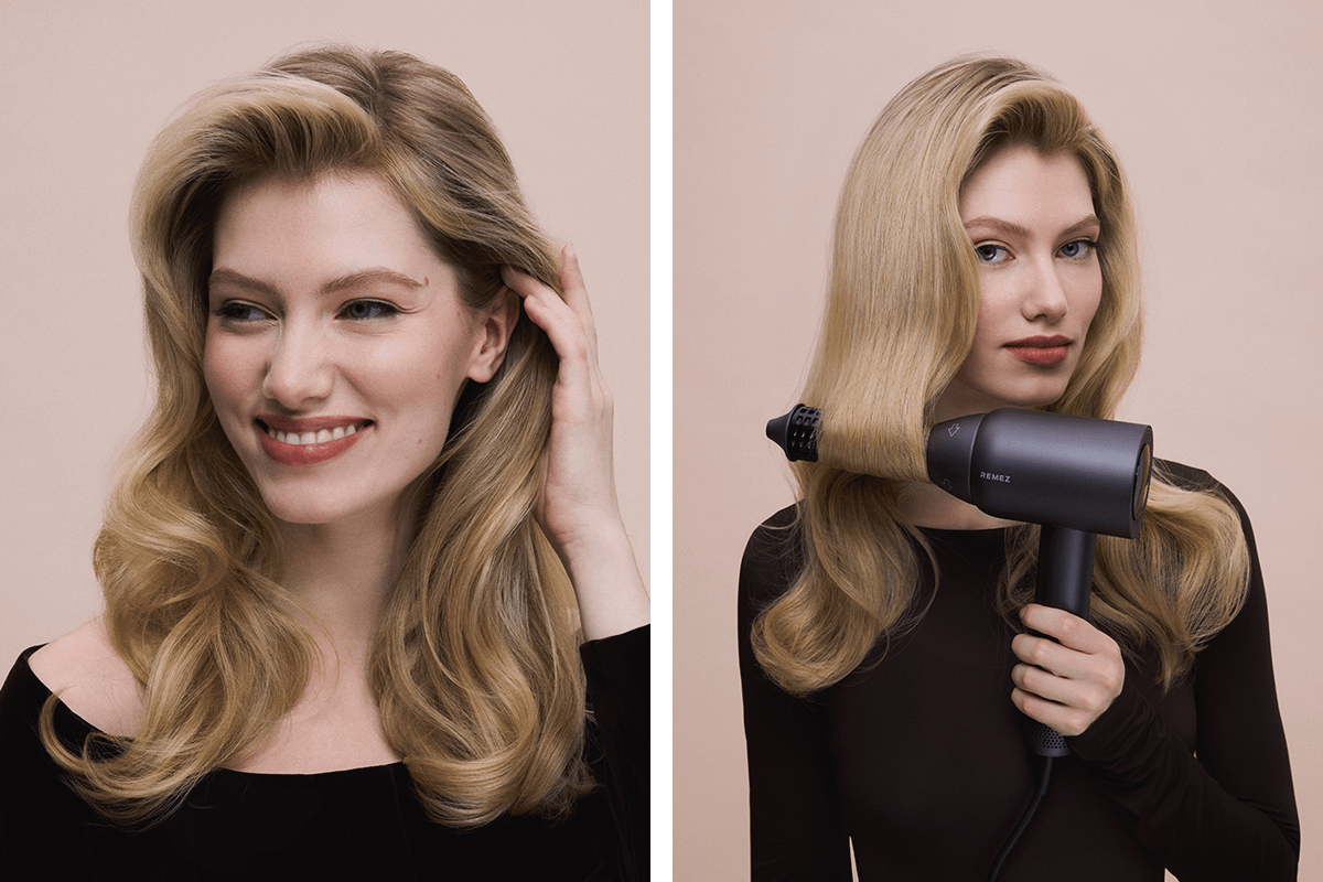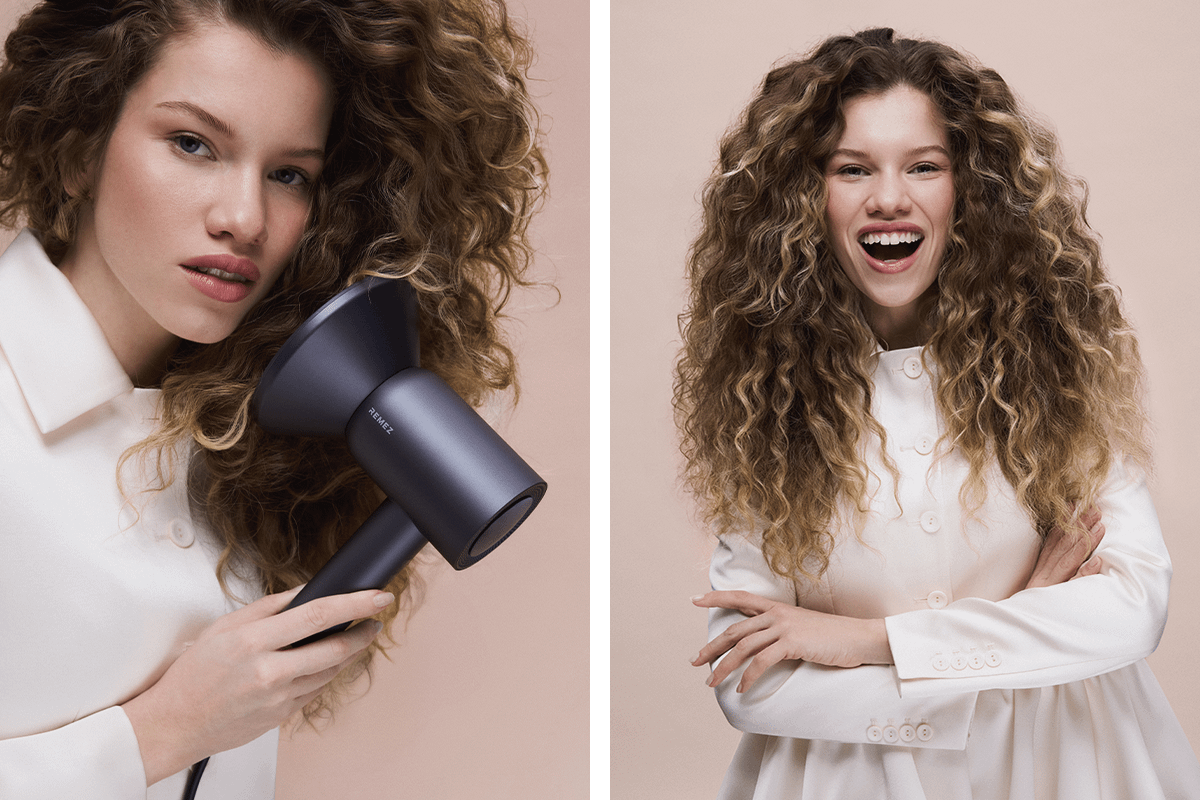 - Не трогай кудри руками, чтобы не сломать завиток. Чтобы пряди не слипались, достаточно менять положение фена и немного крутить головой. С REMEZ Model S это просто — он легкий и тихий, ты не устанешь за время сушки.