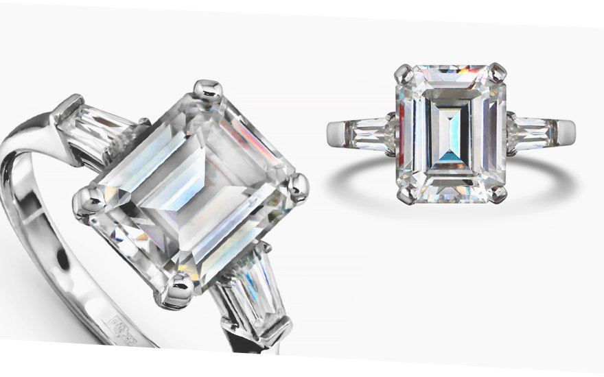 Кольцо с муассанитом изумрудной огранки, перенявшее дизайн Promise от Graff Diamonds. По форме украшение напоминает обручальное кольцо Грейс Келли от Cartier, стоимостью 4,7 млн. долларов. Надеть на безымянный палец аксессуар с поистине королевским дизайном — действительно мечта, тогда зачем отказывать себе в ее исполнении?