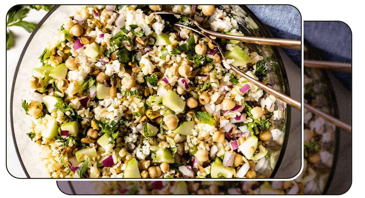 Залей кипятком булгур (в пропорции 1:2), накрой крышкой и оставь на 10–15 минут, чтобы он впитал воду. Затем в большой миске соедини булгур, нут, огурец, красный лук, петрушку, мяту и фисташки. Полей салат лимонным соком и оливковым маслом. Посоли, поперчи по вкусу. Тщательно перемешай все ингредиенты и дай салату немного настояться перед подачей — так он станет еще вкуснее.