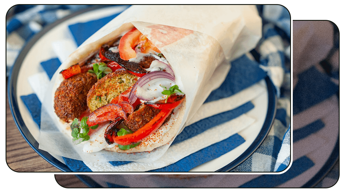 Смешай все ингредиенты для соуса и оставь в холодильнике на 10–15 минут. В это время нарежь свежие овощи и слегка прогрей на сковороде питу. Затем выложи на лепешку листья салата, овощи, 2–3 фалафеля, сверху — соус. Сверни гирос рулетиком или подай открытым.
