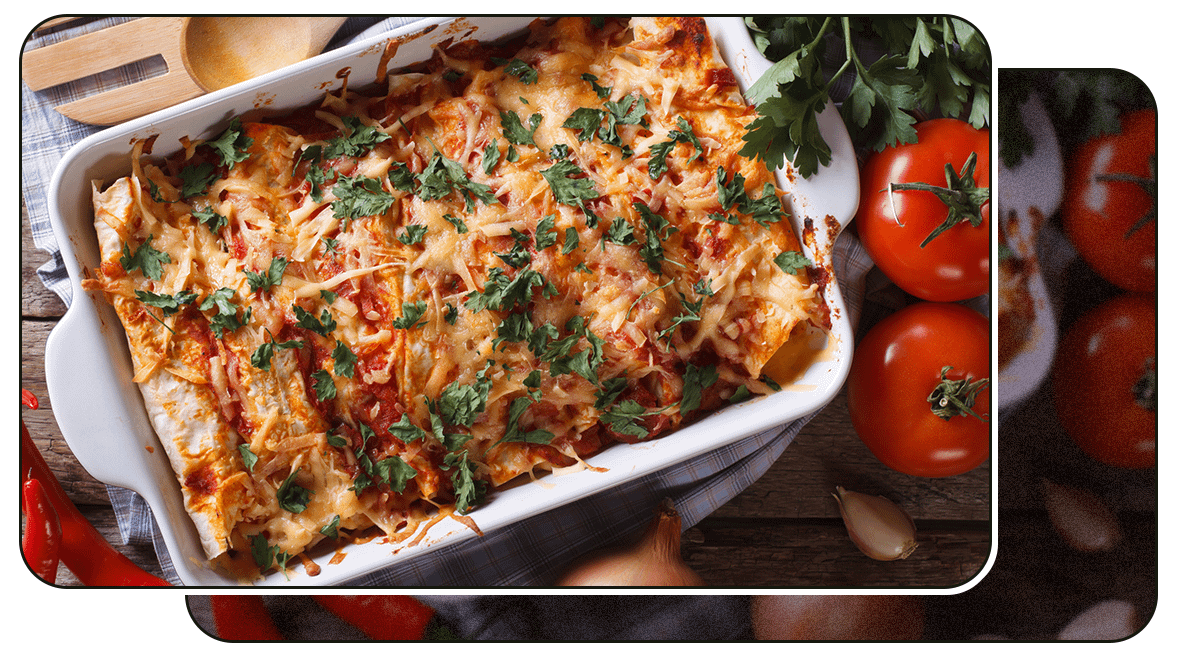 Выпекай блюдо 20–25 минут в духовке, разогретой до 180 °C. Подавай горячие энчиладас с ложкой сметаны или гуакамоле.