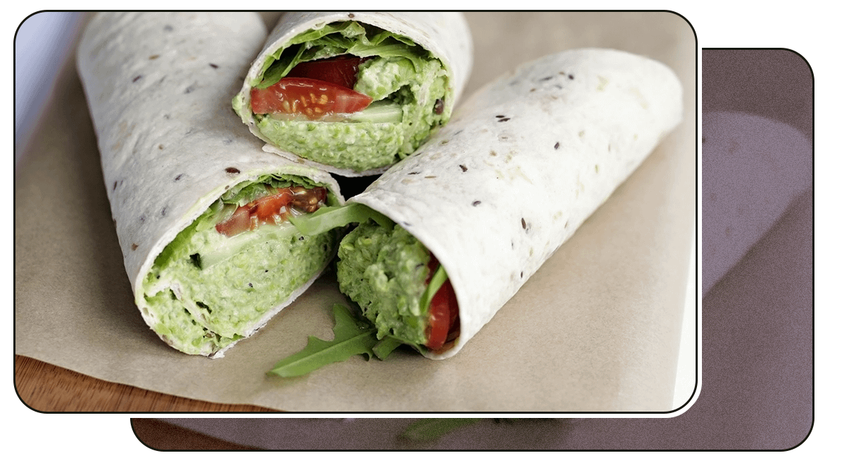 Чтобы приготовить крем, разомни авокадо вилкой, добавь лимонный сок, соль и перец. Перемешай до однородной массы. Далее смажь каждый лист лаваша хумусом или йогуртом, затем — слоем пюре из авокадо. Выложи по центру каждого листа шпинат, овощи и зелень. Плотно сверни каждый лист лаваша в рулет, подгибая края внутрь. Разрежь пополам под углом — получится 8 рулетиков.