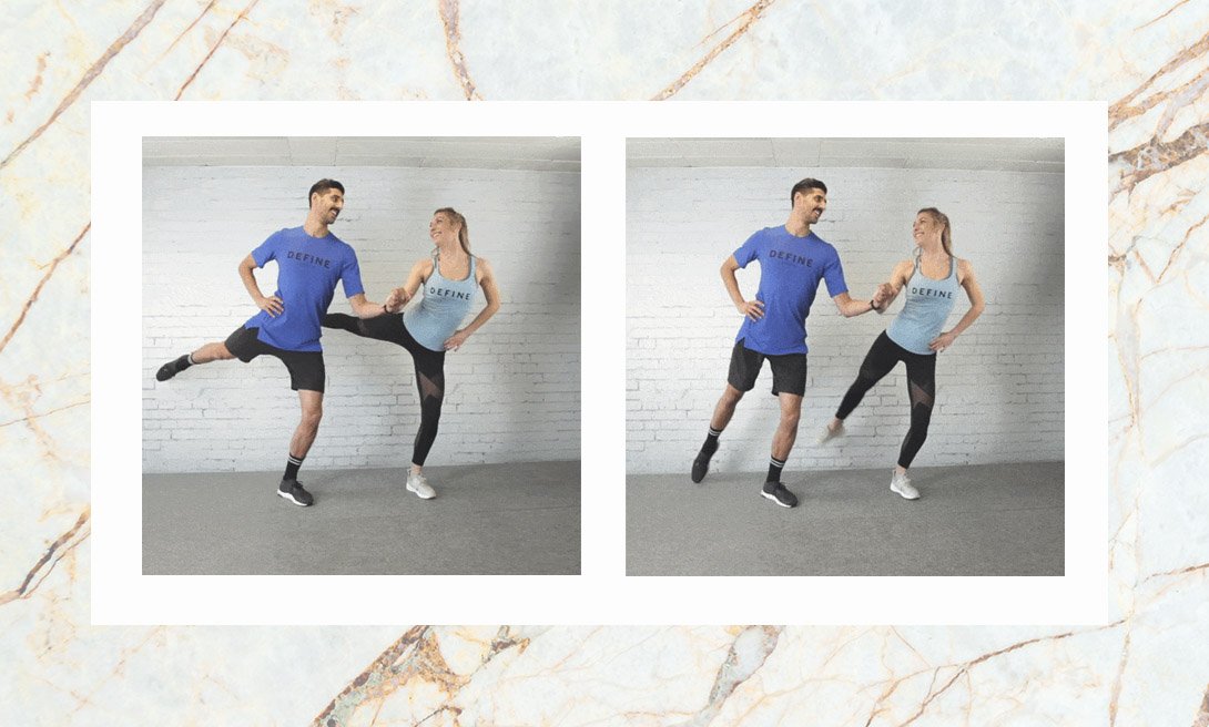 Пары, которые балансируют вместе, остаются вместе. Упражнение помогает улучшить равновесие и координацию движений, прорабатывает мышцы ног и ягодиц.
