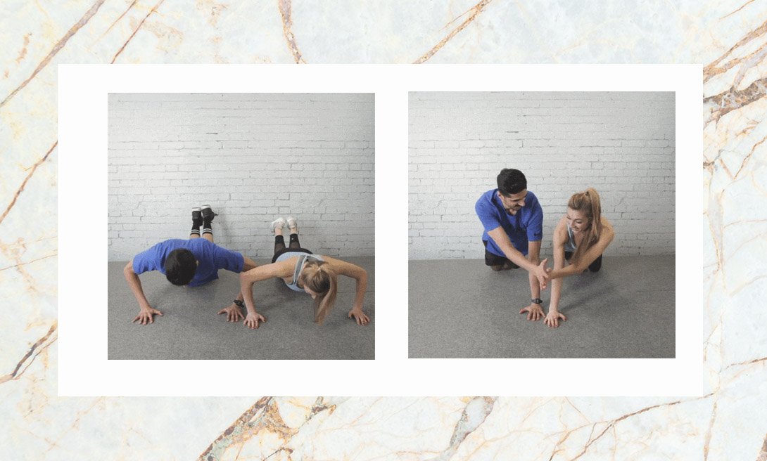 Выпрями тело и опустись вниз. Подними тело, опираясь на выпрямленные руки и колени. Если ты расположилась слева, подними левую руку, а твой партнер пусть поднимет правую. Потянитесь свободными руками друг к другу и коснитесь ладоней. Вернитесь в исходное положение и сделайте 10 подходов.