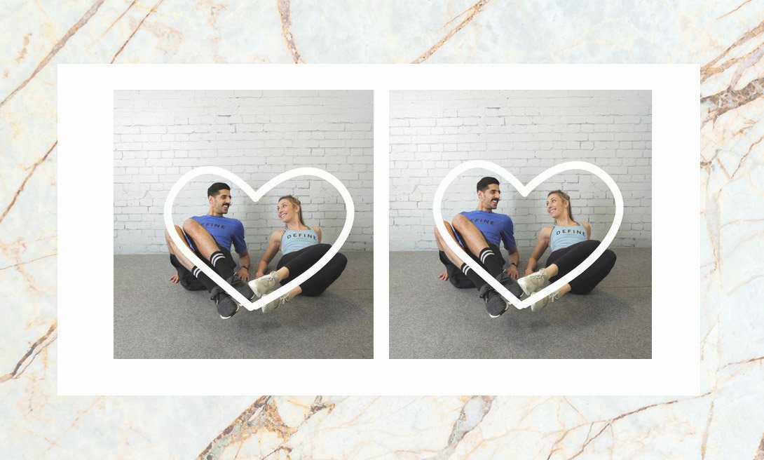 Как выполнить: сядьте на пол бок о бок. Обопритесь на предплечья и нижний отдел спины. Напрягите живот и двигайте ногами из стороны в стороны, огибая форму половинки сердца. Сделайте 10 подходов.