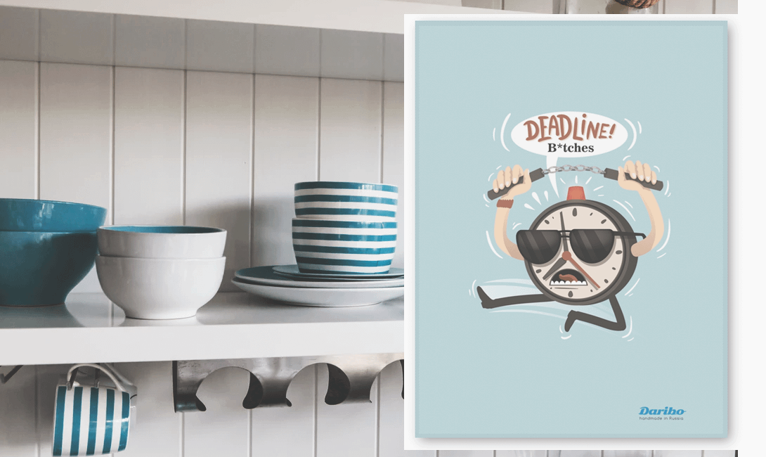Аксессуар изготовлен из качественного хлопка, имеет две петельки, благодаря чему его можно разместить в любом месте. Это полотенце станет оригинальным напоминанием для тех, кто много работает и не успевает следить за временем. Ты можешь быть уверена — теперь все статьи, отчеты и проекты будут сданы вовремя.