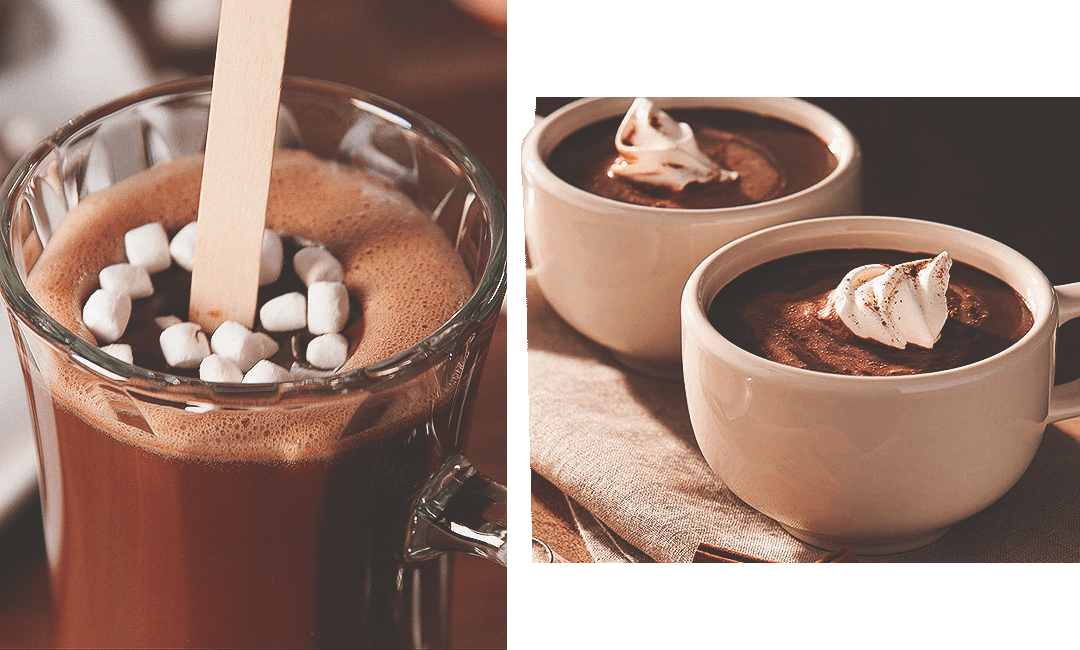 Растопи шоколад в большой миске, перемешай до однородности. Укрась бокалы кулинарной присыпкой – для этого можешь сначала намазать края горячим шоколадом, и только потом макнуть их в рассыпанные на плоской тарелке украшения. Подавать с горячим какао.